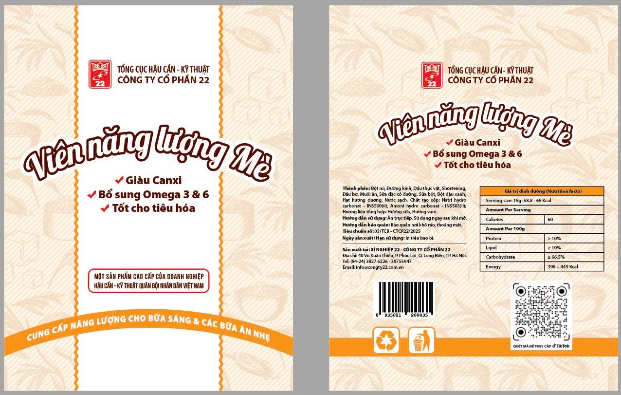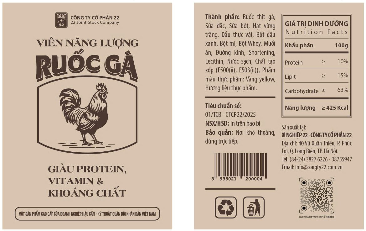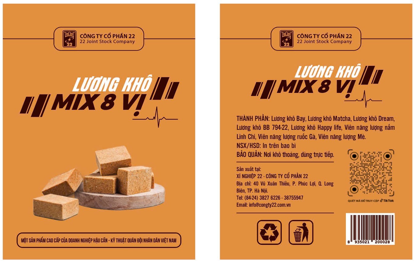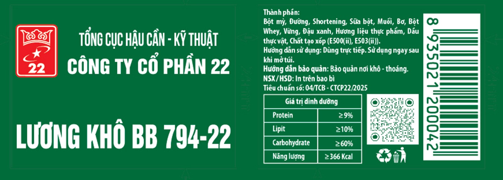 Lương khô bộ binh BB794-22 – Công thức đặc biệt với hàm lượng calo cao, giàu protein và chất béo lành mạnh, giúp bổ sung năng lượng bền vững, thích hợp cho những người vận động cường độ cao hoặc làm việc ngoài trời.