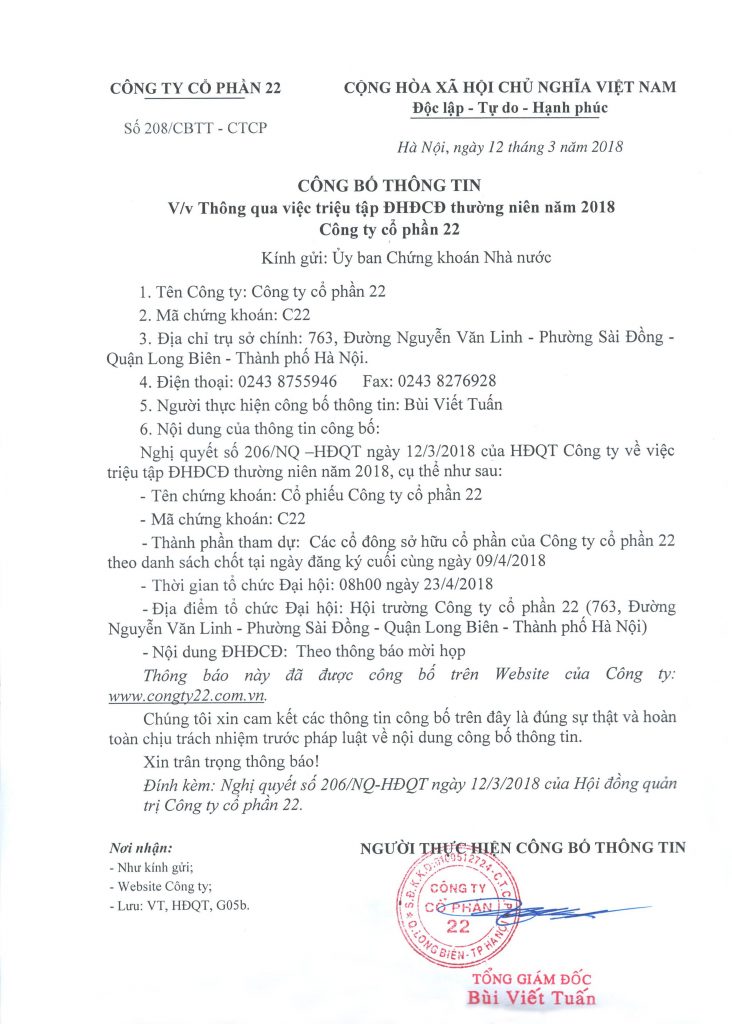 Công bố thông tin về việc triệu tập ĐHĐCĐ thường niên năm 2018