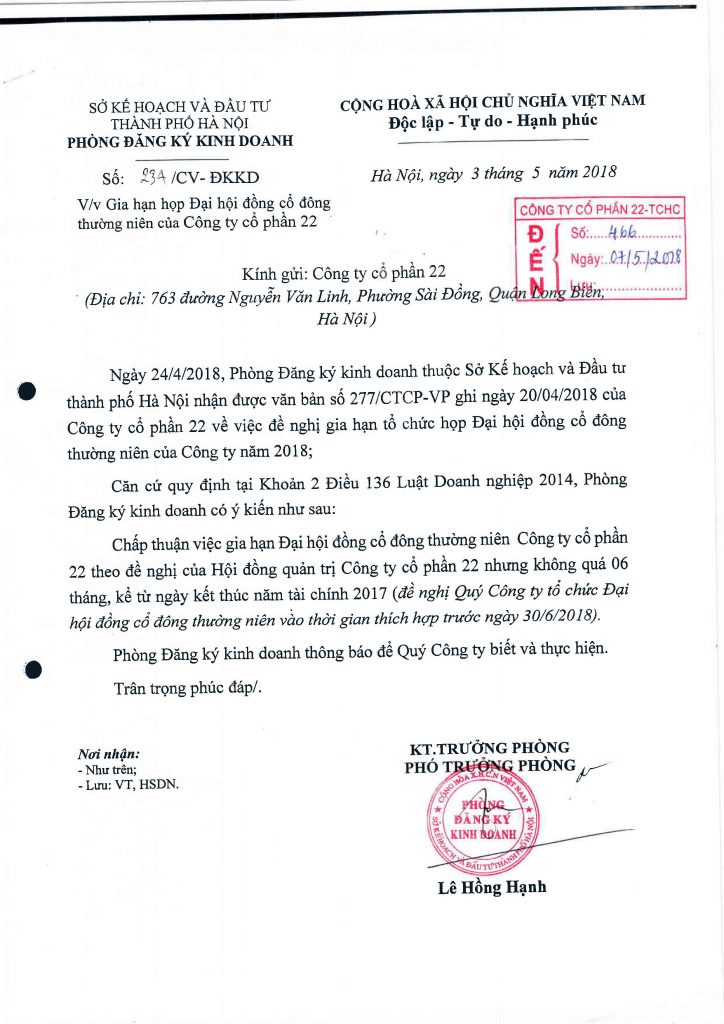 Công ty Cổ phần 22 công bố thông tin về việc được chấp thuận gia hạn thời gian tổ chức Đại hội đồng cổ đông thường niên năm 2018
