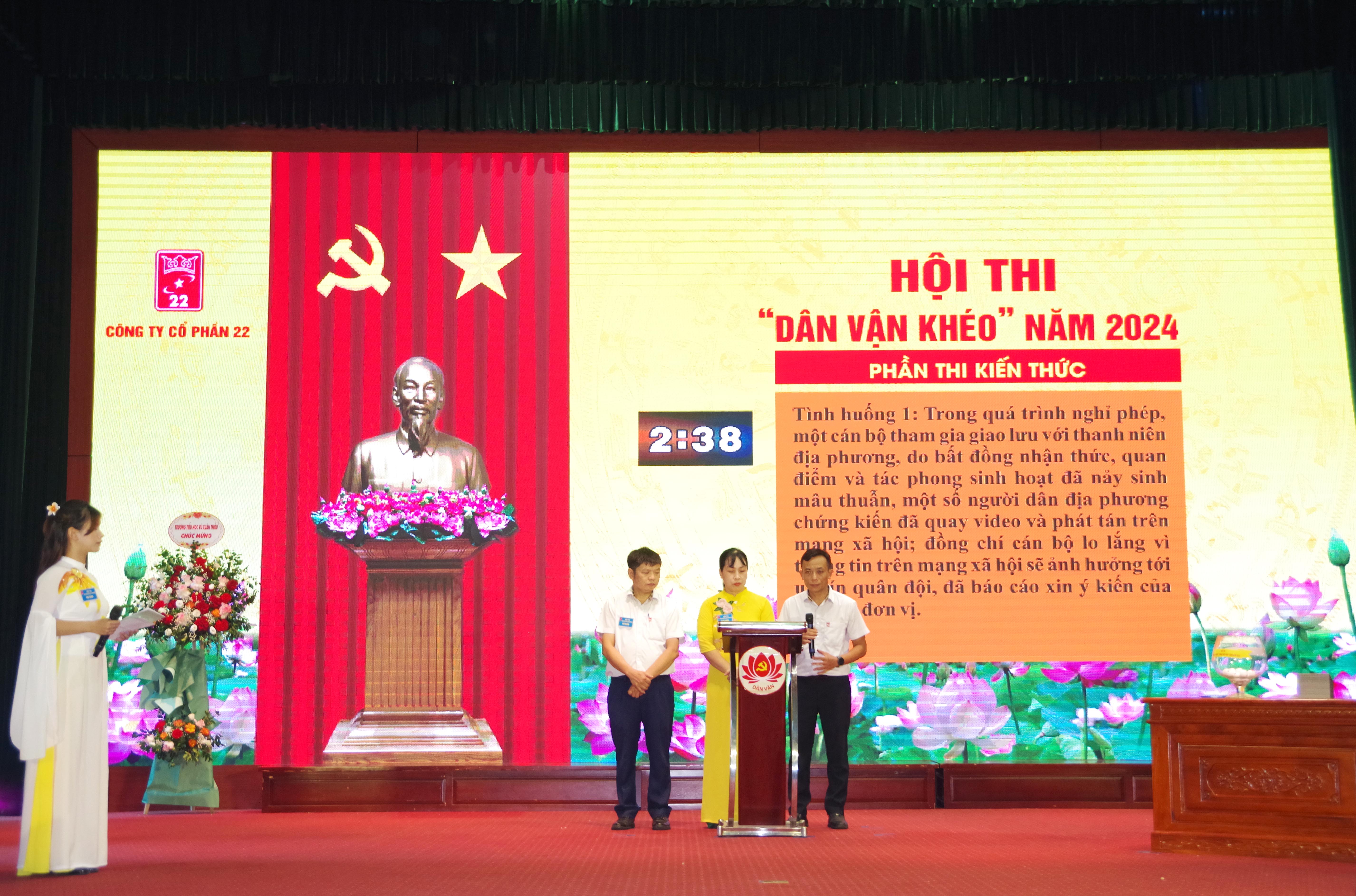Những nội dung tham gia thi của Công ty CP 22 gồm ba phần: Phần thi giới thiệu, phần thi kiến thức và phần thi tiểu phẩm “Dân vận khéo” xử lý tình huống (với hình thức sân khấu hóa). Từ việc nắm vững các nội dung trong công tác dân vận, đội thi đã vận dụng, cụ thể hóa công tác dân vận theo hình thức khác nhau một cách có hiệu quả và thiết thực. Công ty đã tích cực tìm tòi, nghiên cứu, dàn dựng và chuẩn bị các phần thi có tính khoa học; khai thác nội dung phong phú, đa dạng để lôi cuốn người xem. Thông qua các hình thức sân khấu hóa nội dung thi đã phản ánh sinh động những kết quả, việc làm thiết thực của đơn vị mình.