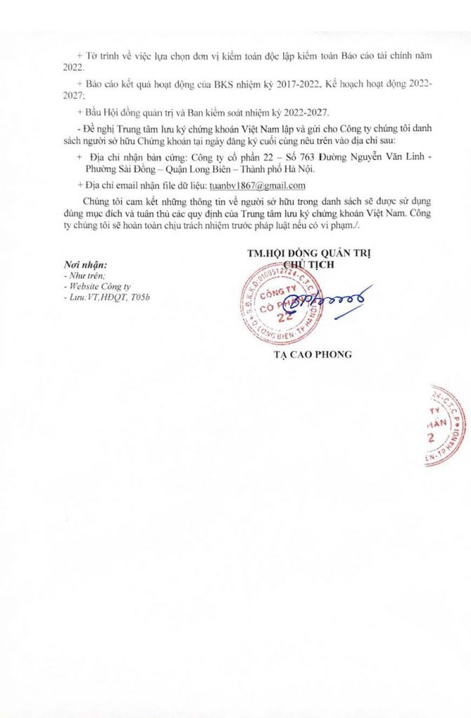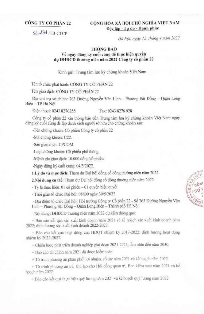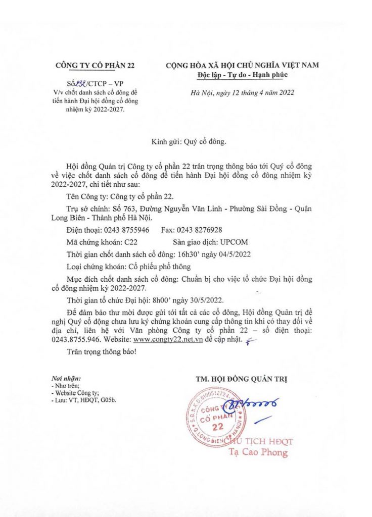Công ty Cổ phần 22 tổ chức Đại hội đồng cổ đông thường niên 2025