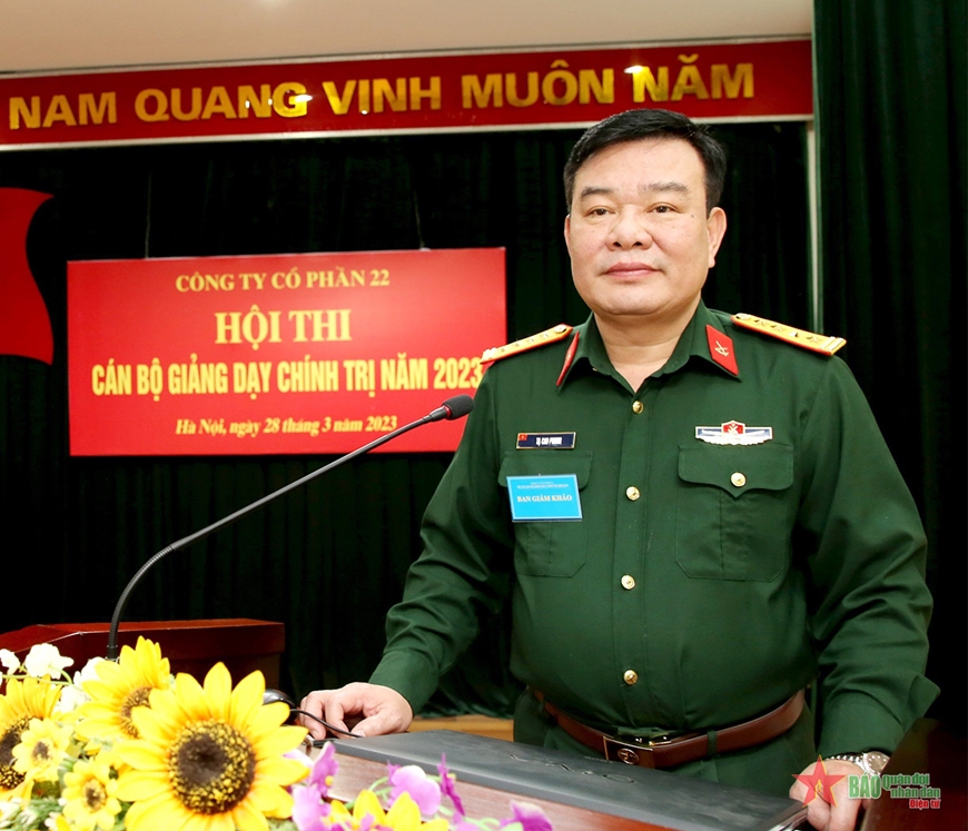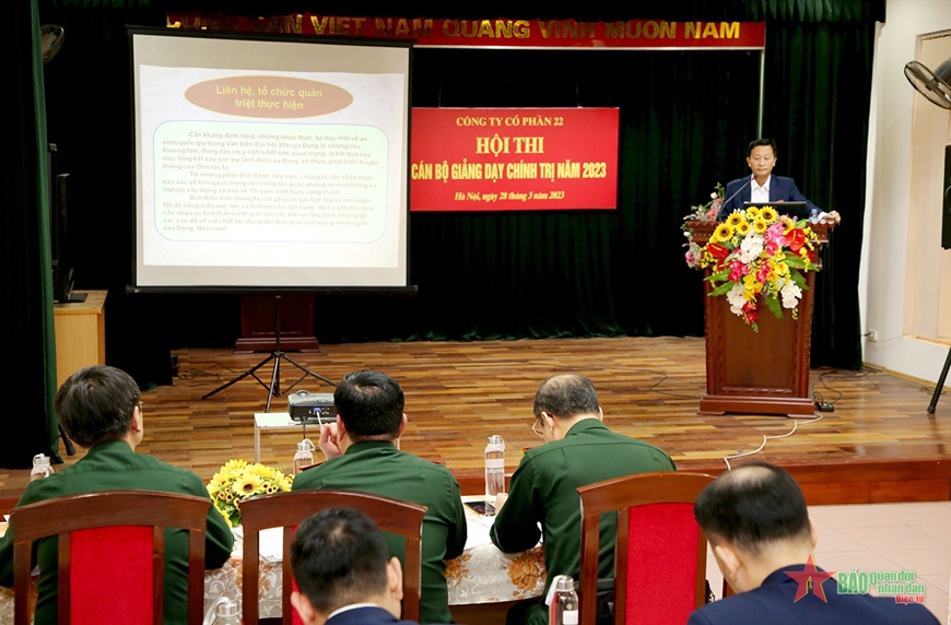 Ngày 28-3, Công ty Cổ phần 22 (Tổng cục Hậu cần) tổ chức Hội thi cán bộ giảng dạy chính trị năm 2023. 13 thí sinh là Bí thư Đảng ủy bộ phận và các bí thư chi bộ thuộc Công ty Cổ phần 22, thực hiện 3 nội dung, gồm: Soạn đề cương chuẩn bị bài giảng (giáo án truyền thống và giáo án điện tử); thi kiến thức và thực hành giảng bài, xử trí tình huống.