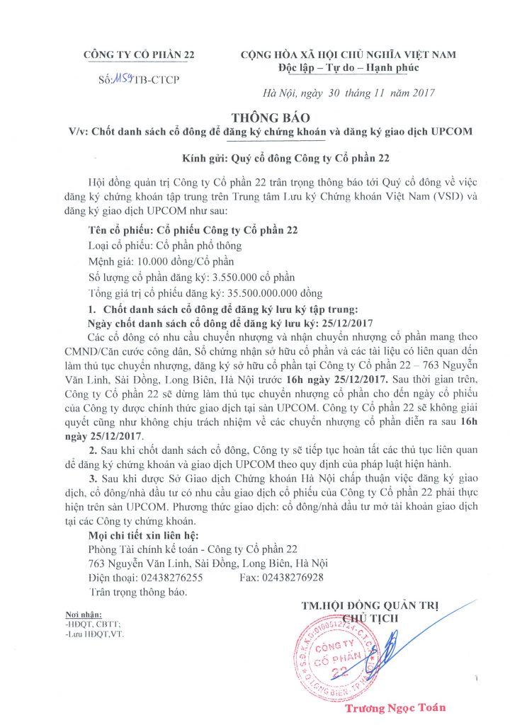 Thông báo chốt danh sách cổ đông để đăng ký chứng khoán và đăng ký giao dịch UPCOM