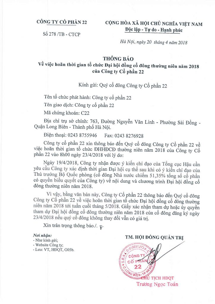 Thông báo về việc hoãn thời gian tổ chức ĐHĐCĐ thường niên năm 2018